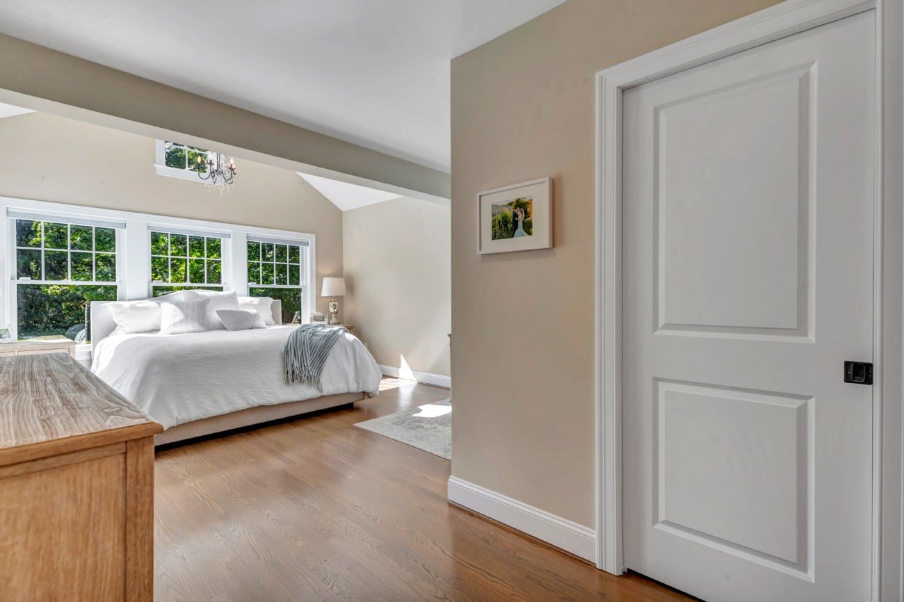 As you approach the property, you’ll be captivated by the home’s striking white cedar shingle siding and sophisticated gabled roof with decorative trusses. The inviting covered front porch, adorned with natural wood furniture and seasonal décor, creates a warm welcome, while the attached two-car garage with carriage-style doors and transom windows adds both functionality and charm to the exterior facade.