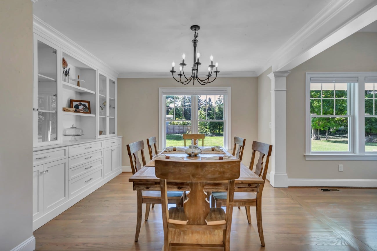The dining room exemplifies refined taste with its custom white glass-front display cabinetry and striking black wrought-iron chandelier. Large windows frame views of the professionally landscaped grounds, creating an elegant backdrop for both casual meals and formal dining occasions.