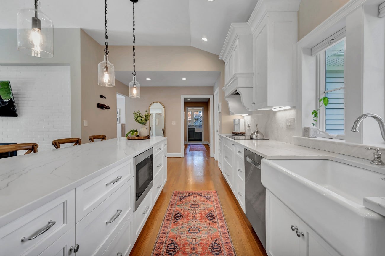 The heart of this magnificent home lies in its gourmet kitchen, where form meets function in perfect harmony. Bright white shaker cabinets, sophisticated quartz countertops, and classic subway tile backsplash create a timeless aesthetic. The generous island, crowned with modern pendant lighting, serves as both a culinary workspace and casual dining area, perfect for family gatherings and entertaining.