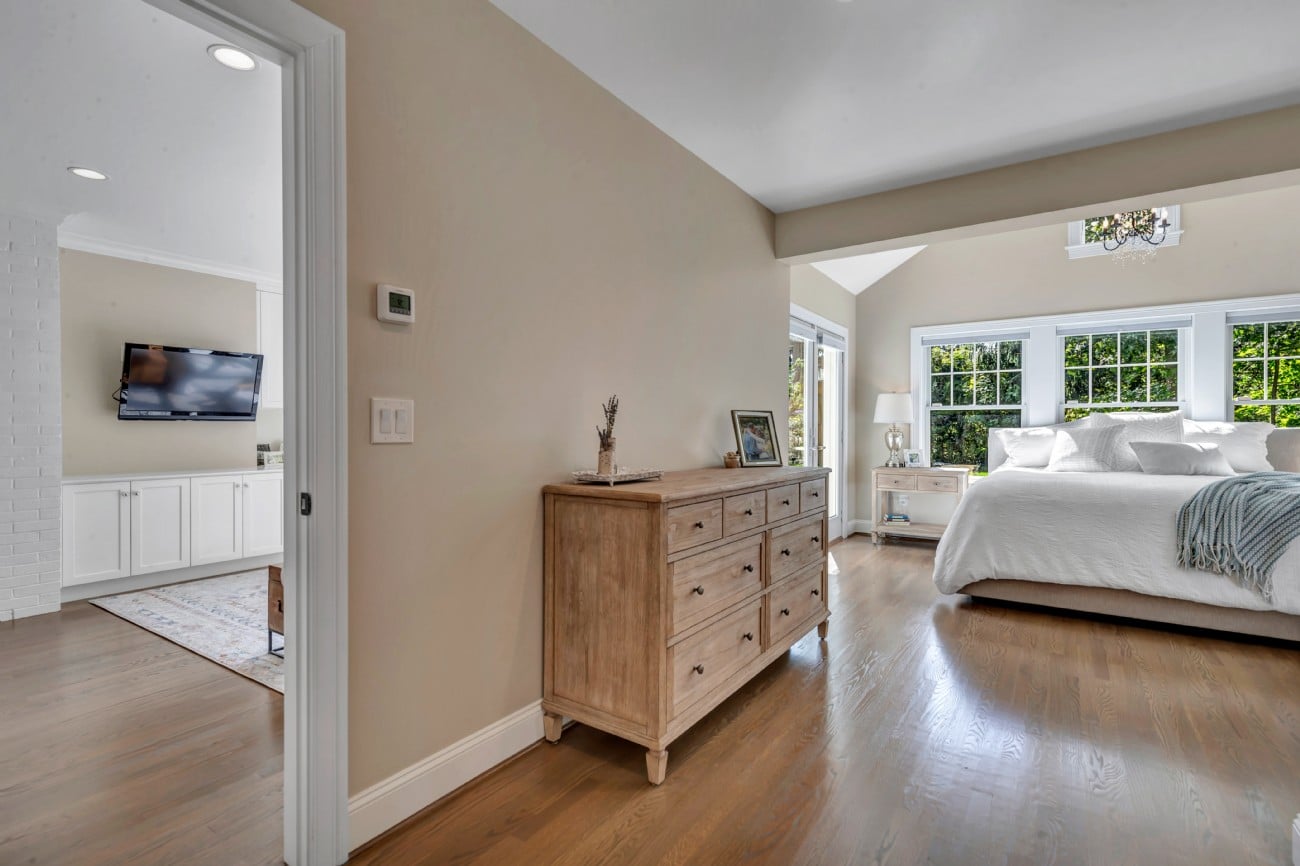 For those seeking convenience and comfort, the main-level master suite offers a private retreat, while two additional bedrooms provide ample space for family or guests. The home’s two full bathrooms and powder room are appointed with premium fixtures and finishes, maintaining the property’s sophisticated aesthetic.